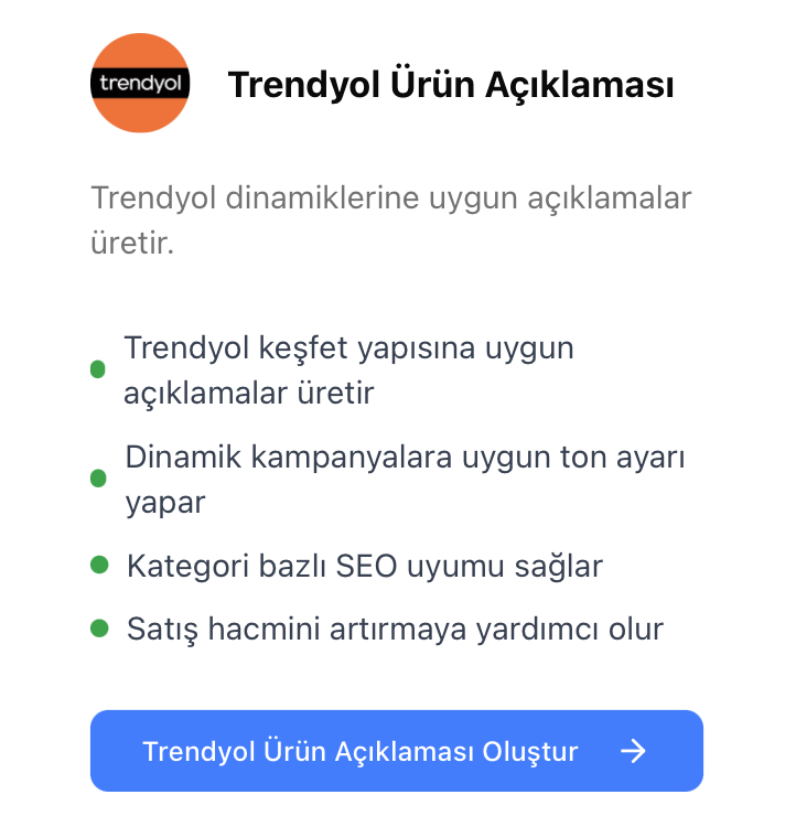 Farklı pazaryeri formatlarına uygun metin ve görseller üretin. İçeriği tekrar düzenlemek zorunda kalmadan yayına alın.
